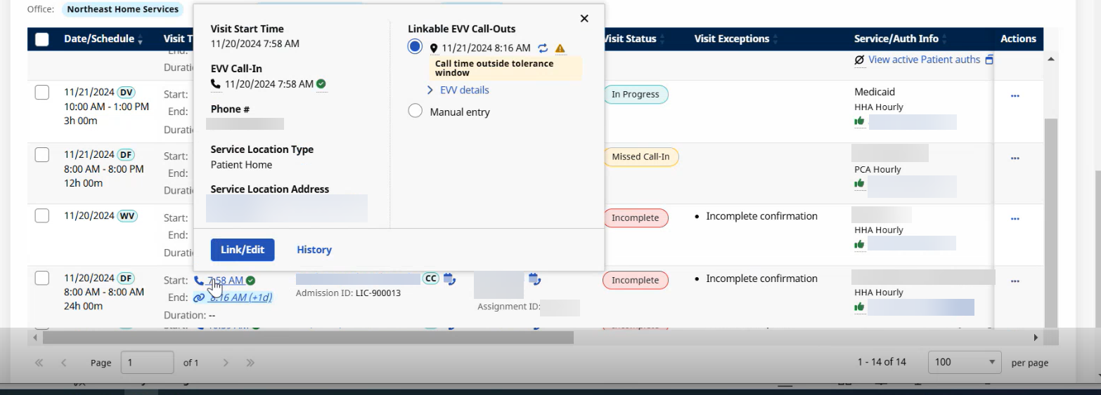 Click the Link/Edit button to open the Link EVV/Edit Visit Times window. Use the Link EVV/Edit Visit Times window to link, unlink, or manually link EVV Call-Ins to EVV Call-Outs.