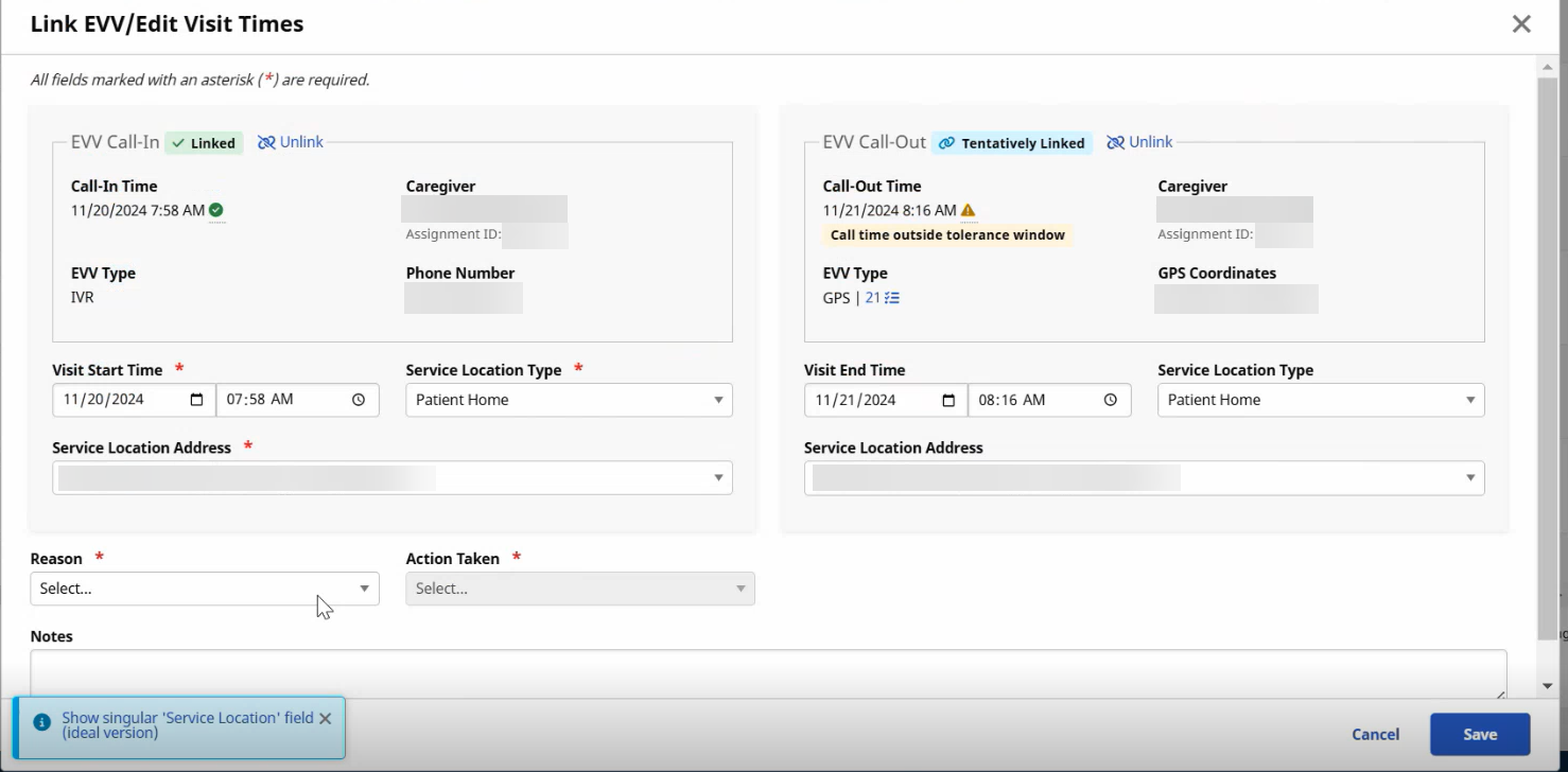 Previously-entered Visit Start and Visit End Time information displays. Use the fields below the EVV Call-In and EVV Call-Out information to manually adjust times, Service Locations Address and/or Service Location Type.
