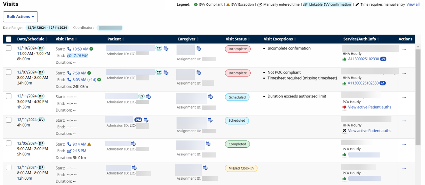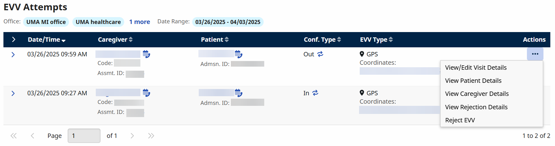 Select the Ellipses... under the Actions column for additional ways to access the Patient or Caregiver details. You can also edit Visit details or reject the EVV.