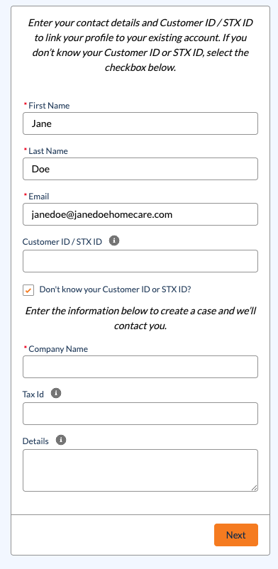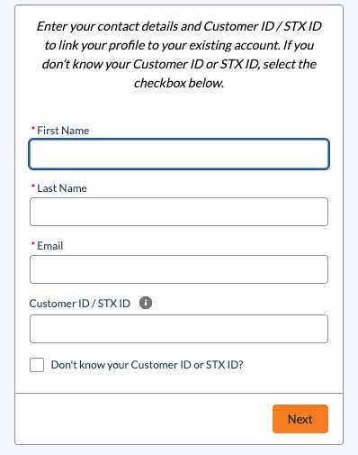 If you do not know your Cusomer ID or STX ID number, select the check box and additional fields display. Complete the new fields, and then select Next.